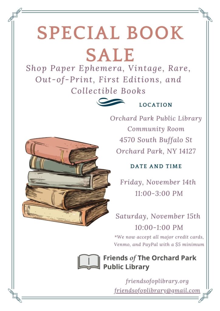The Friends of the Orchard Park Public Library will hold its next Book Sale Friday, December 5 through Saturday, December 6 at the Orchard Park Public Library, 4570 South Buffalo Street in Orchard Park (map).